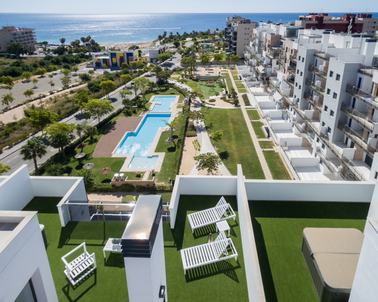 Este lujoso complejo consta de 3 bloques de viviendas de 6 plantas de 2 y 3 dormitorios y con 2 baños, instalación de aire acondicionado en todas las habitaciones, terrazas privadas y parking privado opcional con trastero.