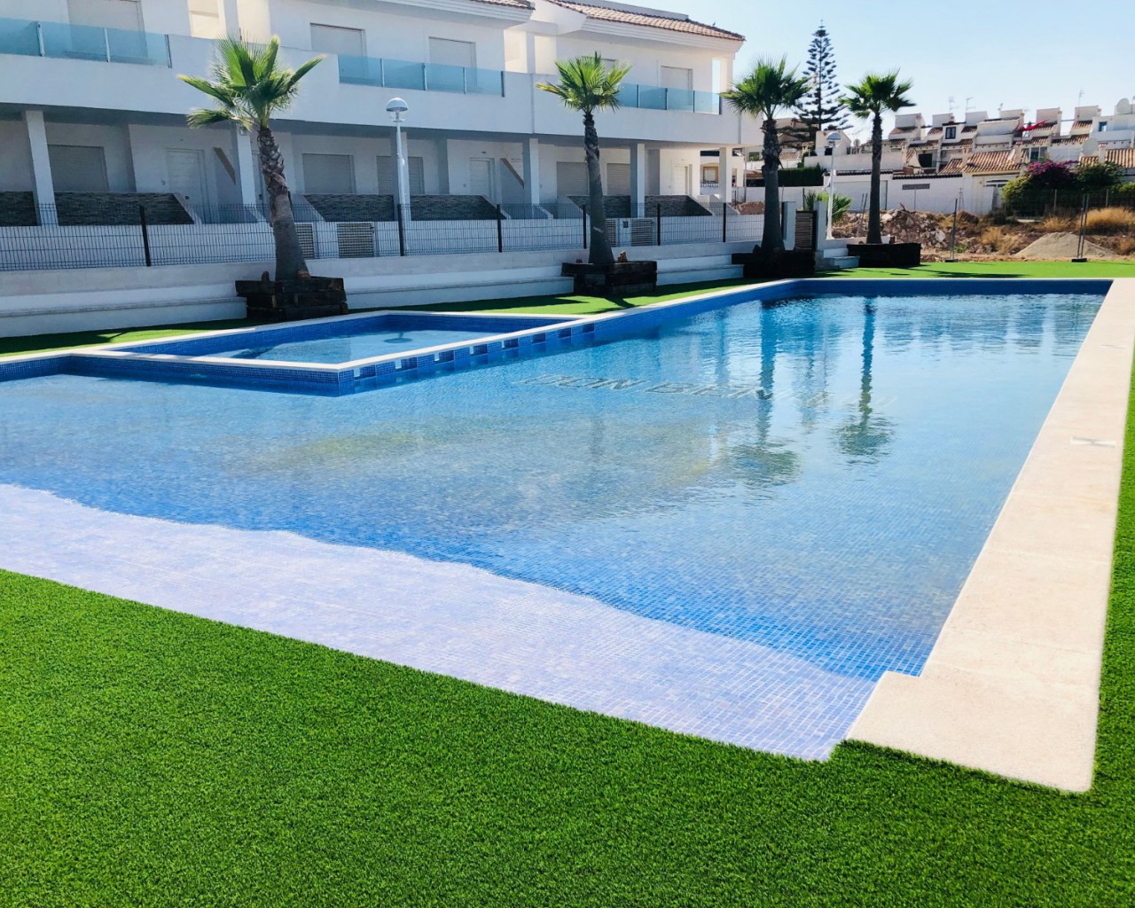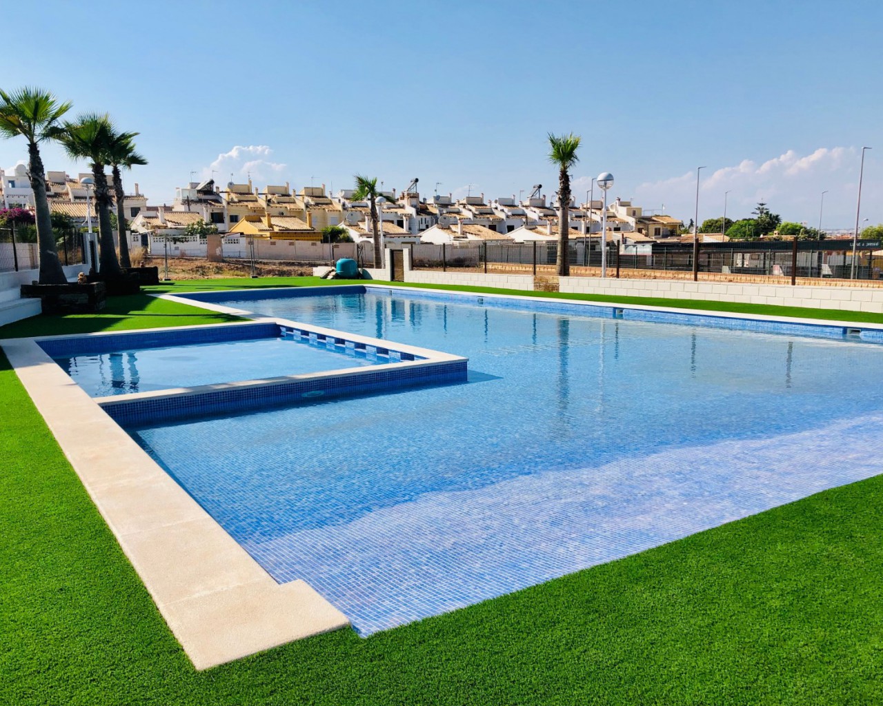 La zona comunitaria es el elemento central del complejo, con una gran piscina para adultos y niños, zonas verdes y espacio para relajarse alrededor de la piscina.
