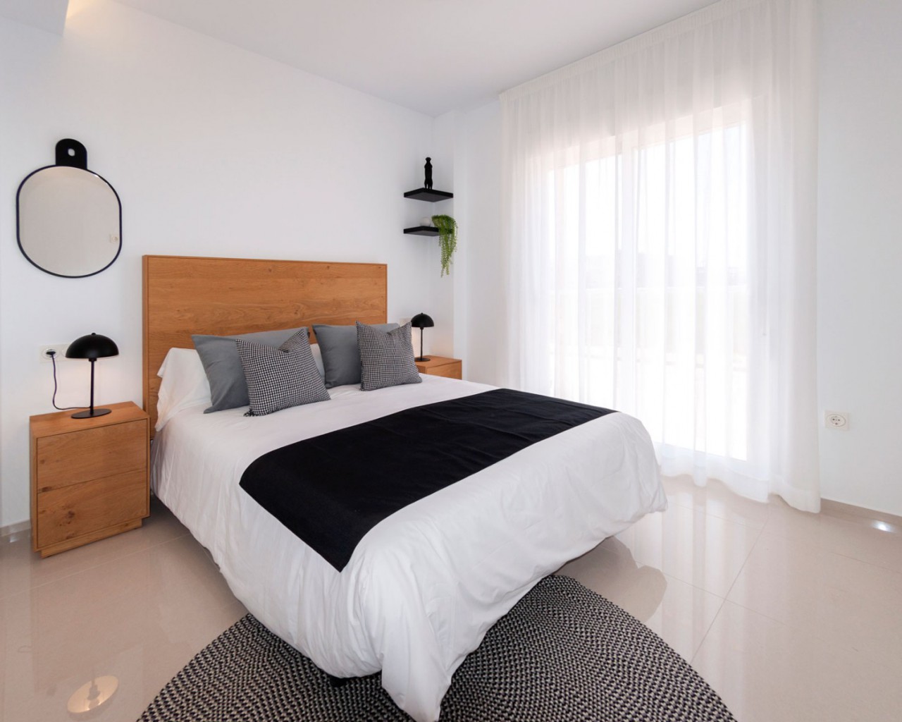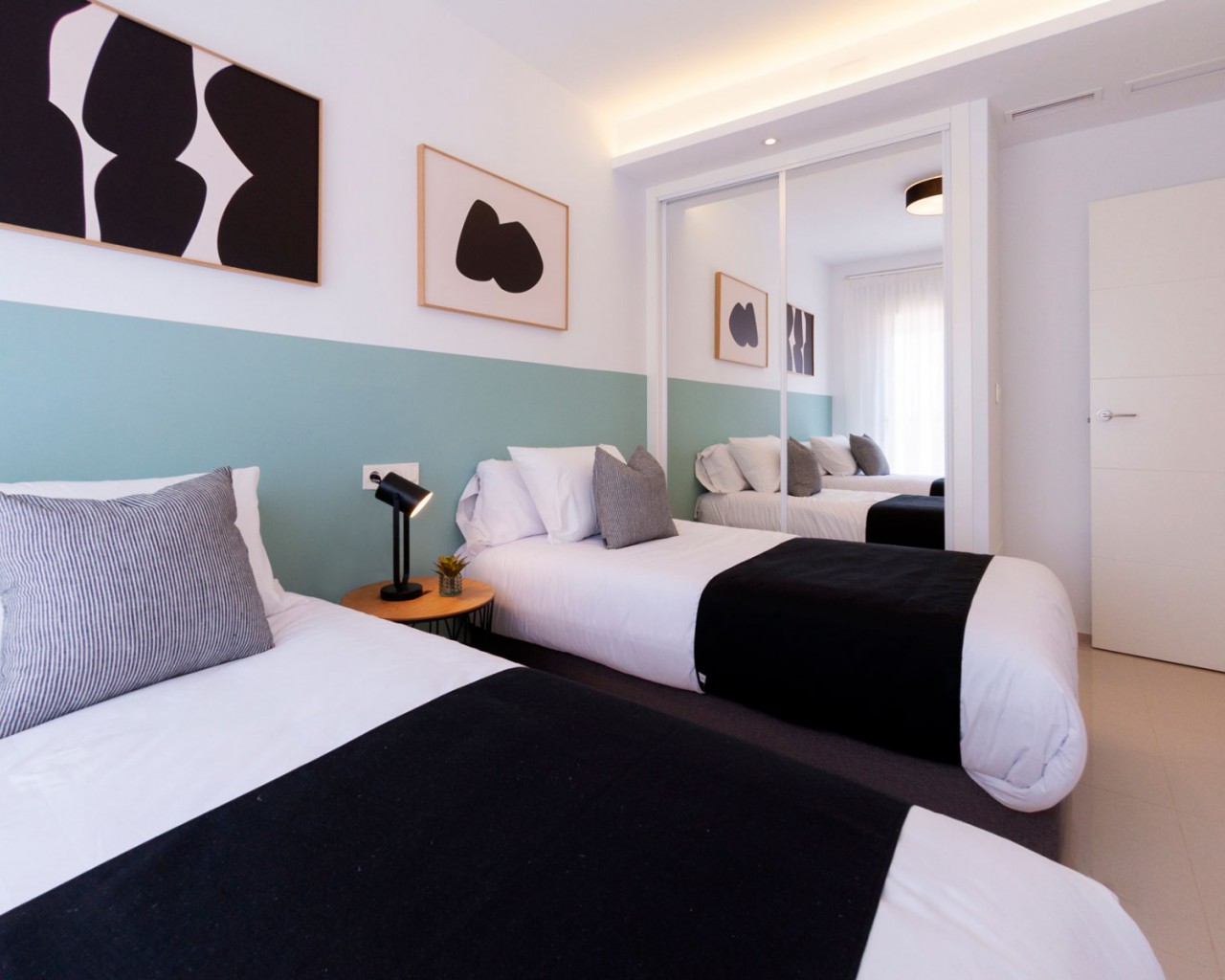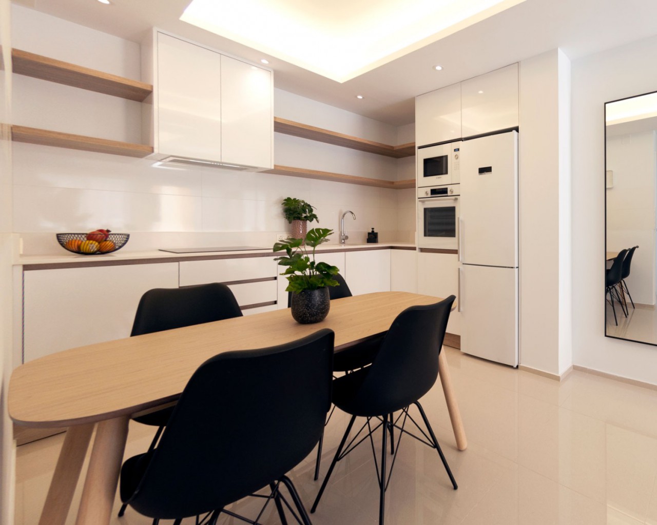 Los apartamentos tienen 2 dormitorios, dependiendo del tipo 1 o 2 baños, una moderna sala de estar, cocina abierta y terraza. Los apartamentos más altos disponen de solárium privado con bonitas vistas. Todos los apartamentos disponen de armarios empotrados en los dormitorios y preparación para la climatización. Las piscinas comunitarias se encuentran en los hermosos jardines. Por supuesto, usted tiene su propia plaza de aparcamiento subterráneo.