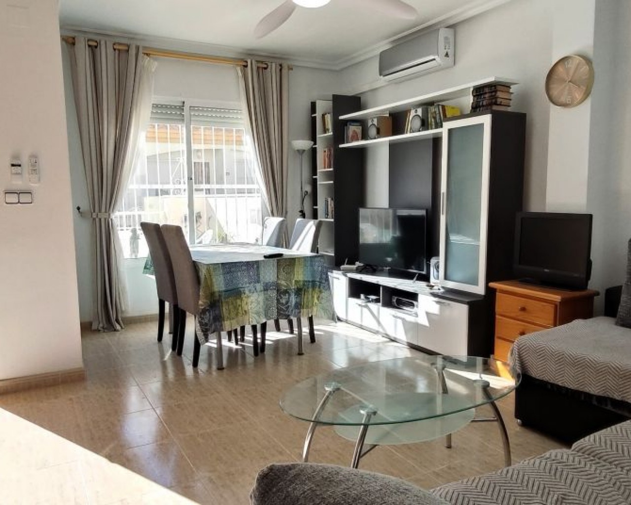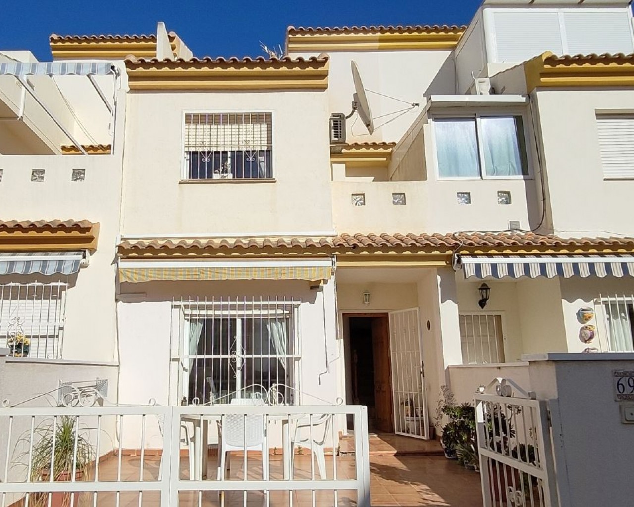 A wonderful opportunity to purchase a spacious 3-bedroom, 2-bathroom townhouse in the highly sought-after Vistamar complex, just 200 metres from the Cabo Roig promenade and beach. Homes of this size in this prime location are always in demand. The property offers excellent privacy with no neighbours above or below, giving it the feel of an independent home. Located within a gated community, it is accessed via a sunny south-facing garden. On the ground floor there is a bright living room, a separate kitchen with access to a patio/utility area, and a shower room. The first floor features two double bedrooms with fitted wardrobes, a small balcony, and a family bathroom. The top floor offers the third bedroom with fitted wardrobes and direct access to a private, sunny roof terrace. The house has new AC for hot/ cols in living room and all three bedrooms. The house would benefit from some light cosmetic improvements, which would easily transform it into a stylish and charming beachside home. The complex features a beautiful communal pool and landscaped green areas, ideal for enjoying the Mediterranean climate. With bars, restaurants, shops, supermarkets, medical centre, transport links and nightlife all within walking distance, this is a perfect location with no need for a car. An excellent choice as a holiday home, permanent residence, or investment property with strong rental potential in one of Cabo Roig’s most desirable beachside settings