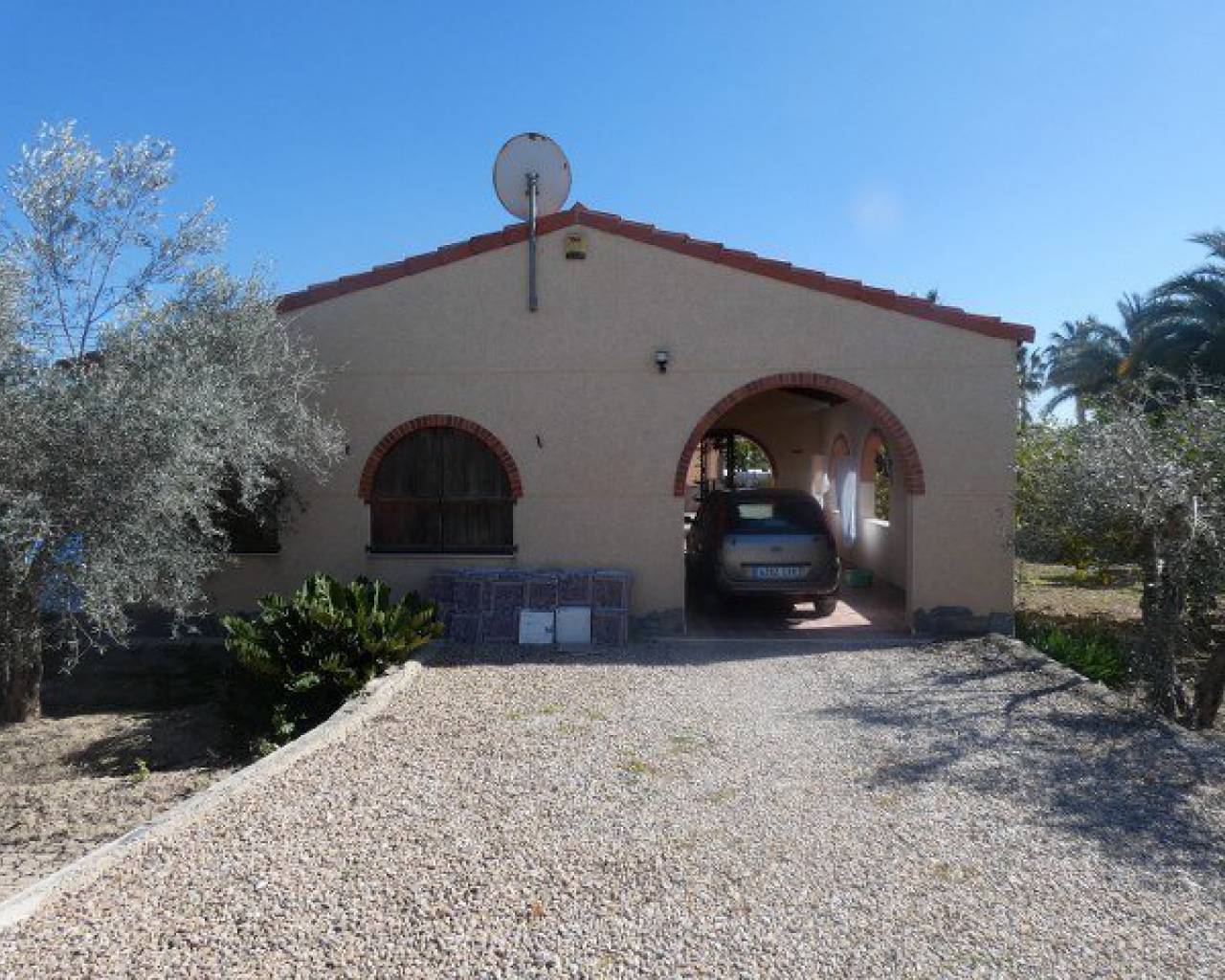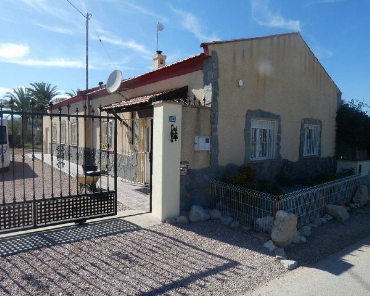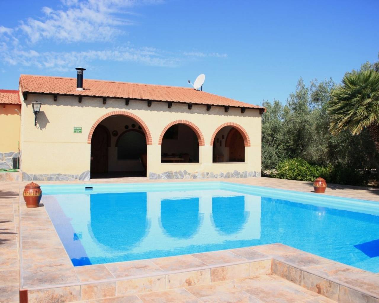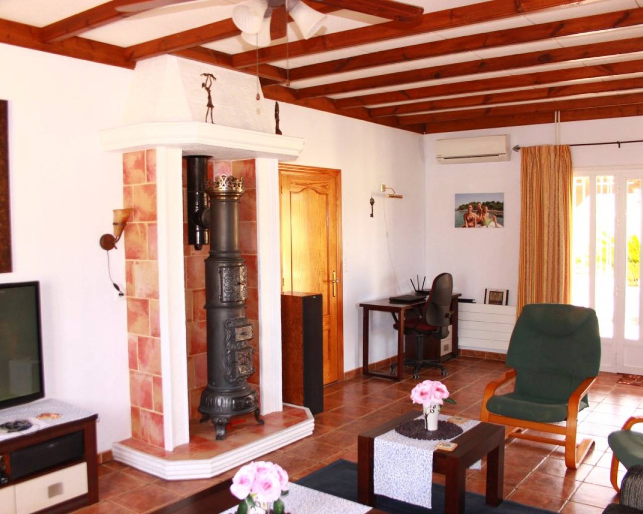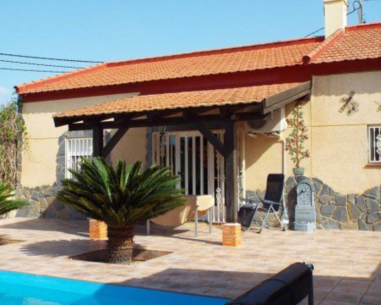 A lovely rustic style finca with lots of charm but with modern facilities and set on a large 7000m2 plot with private pool. A tiled terrace, partly covered for shade, surrounds the pool with the garden beyond which has many established trees and plants. There is a very spacious fully fitted kitchen with ample cupboard space and work surface. The lounge features a log burning fireplace and beamed ceilings making a very cosy feel to this room. The family bathroom is very spacious with a bath tub and walk-in shower plus twin sinks. There is a further shower room and 3 double bedrooms. The property also boasts a large covered and arched terrace, perfect for alfresco dining and entertaining with a summer kitchen and a wooden roof plus space for shaded parking. Outside there are solar panels, lots of off road parking space and storage. The house is surrounded by lovely countryside but with the village of Catral close by which has all the amenities you would need