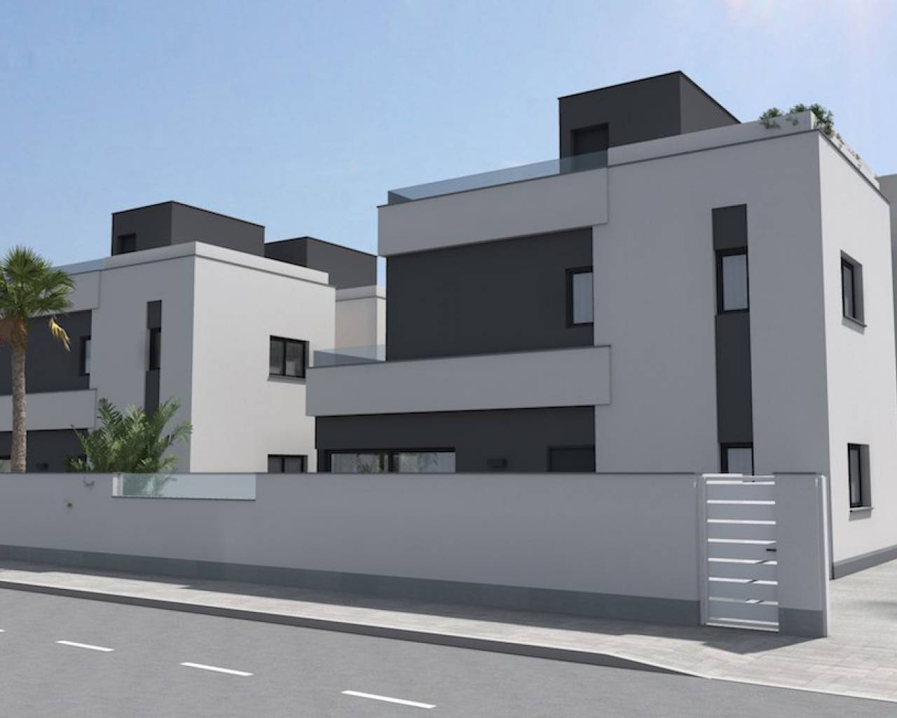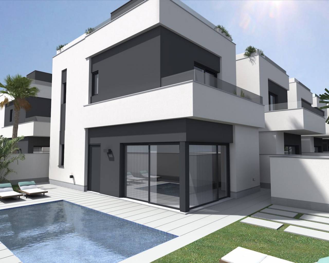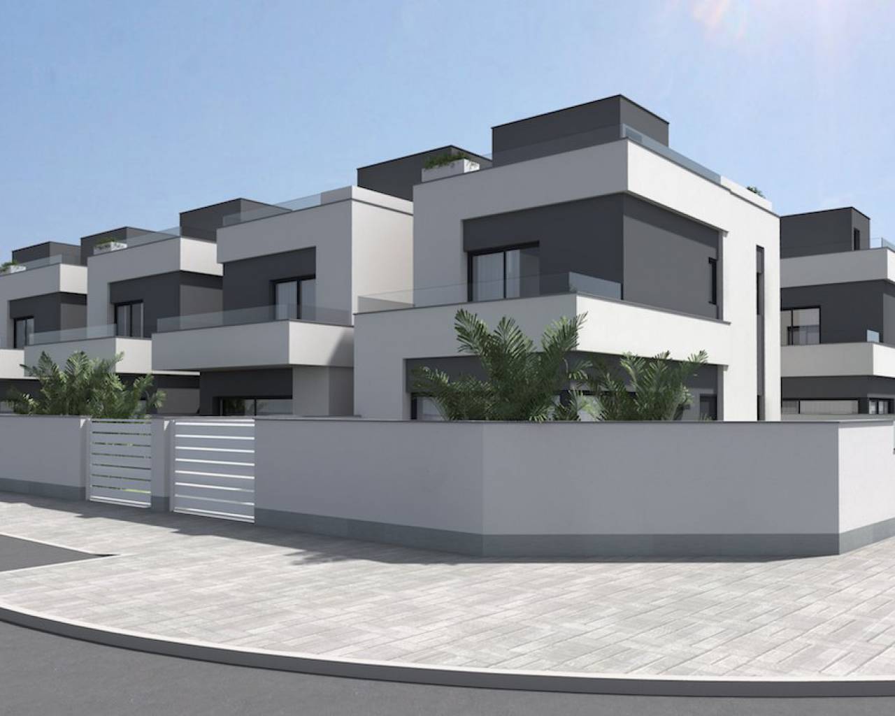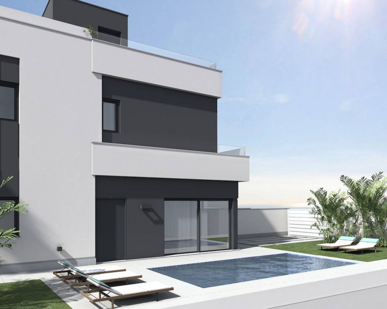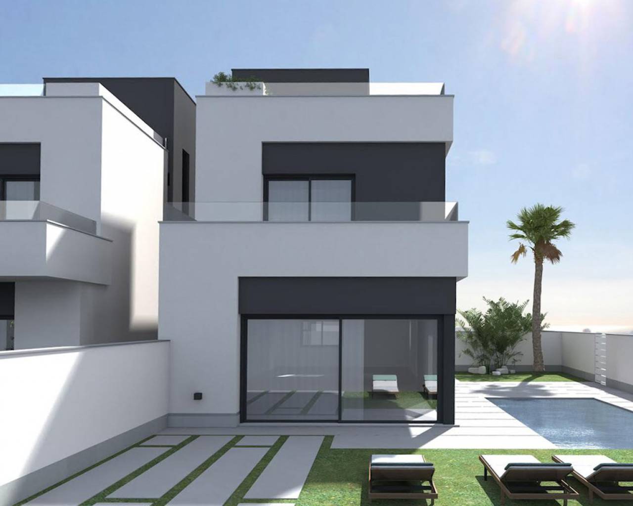 Modern villas located in El Barranco (next to Zenia Boulevard), Orihuela Costa A complex of 10 villas with own plot starting in 120 m2, in a amazing area with all the services at 8 min to the beach by car. And 2 min by car to the autovia A-7, extremely perfect communicated. 3 double bedrooms (double bedroom and a bathroom downstairs) Each bedroom has fitted wardrobes The master bedrooms all have patio doors leading to a large balcony terrace and there are internal stairs leading to the solarium. 2 or 3 bathrooms with underfloor heating Large living room with patio doors leading on to the terrace and garden area open kitchen with fridges-freezer, dishwasher or 45cm, washing machine, extractor, oven, ceramic hob and microwave. Solarium of 32 m2 Front garden of 114-211 m2 Private parking. Included you have underfloor heating in the bathrooms and Pre-installation for A / C. **some plots you have a private pool other have the option of a pool as an extra. NOTE: These images are a preliminary draft of the project, created by computer as an illustration and not binding. The final design may undergo some changes These stunning villas are walkable to bars, shops, restaurants and a school. They are close to several championship golf courses and just a short drive from the beach and the La Zenia Boulevard shopping centre, With easy access via the AP7 and N332 coastal road both Alicante and Murcia San Javier airports can be reached within a 40 minute drive.