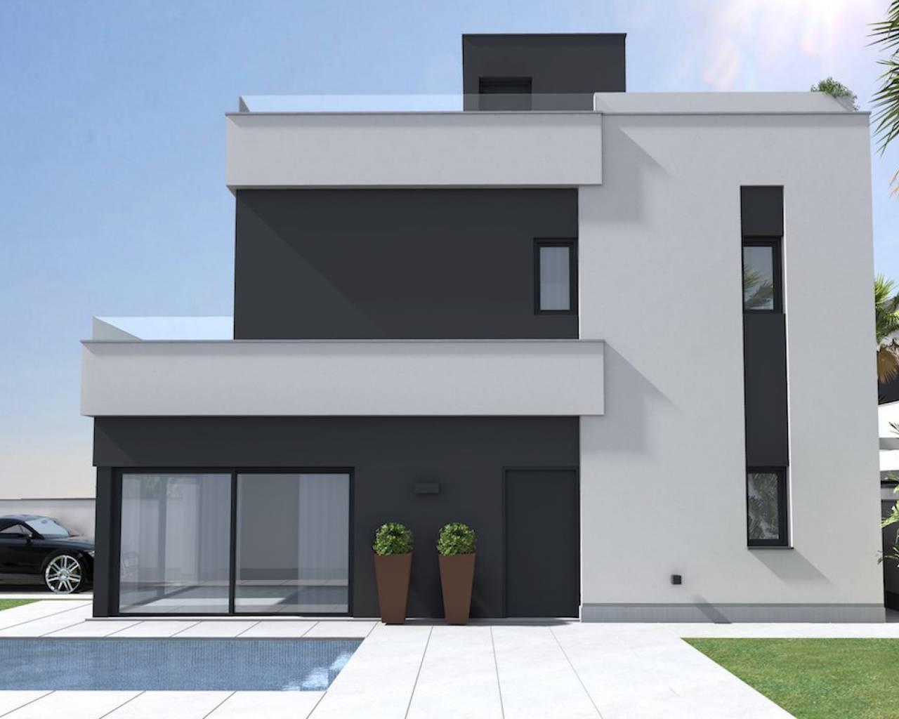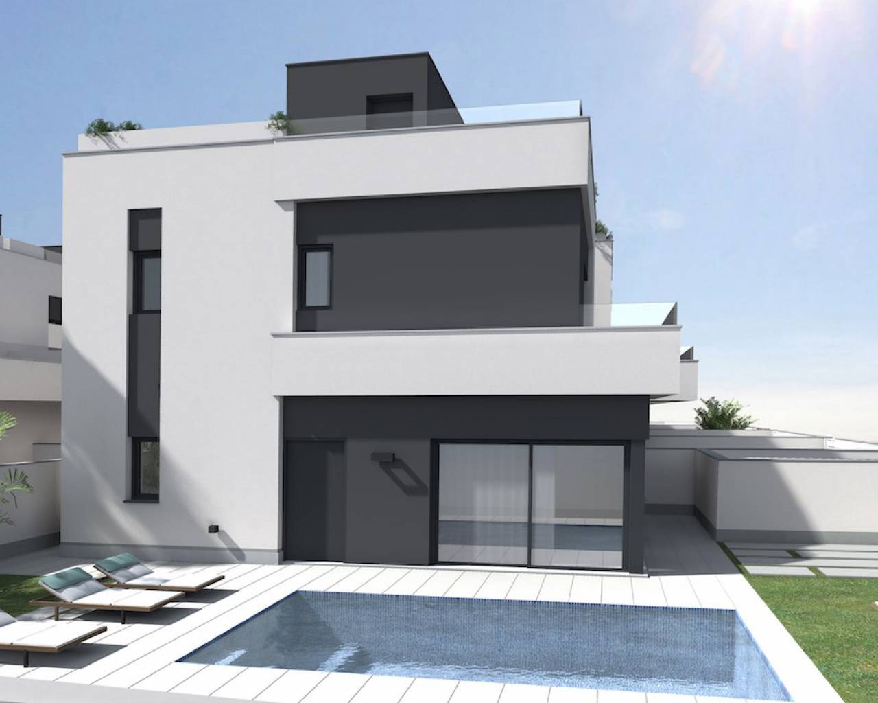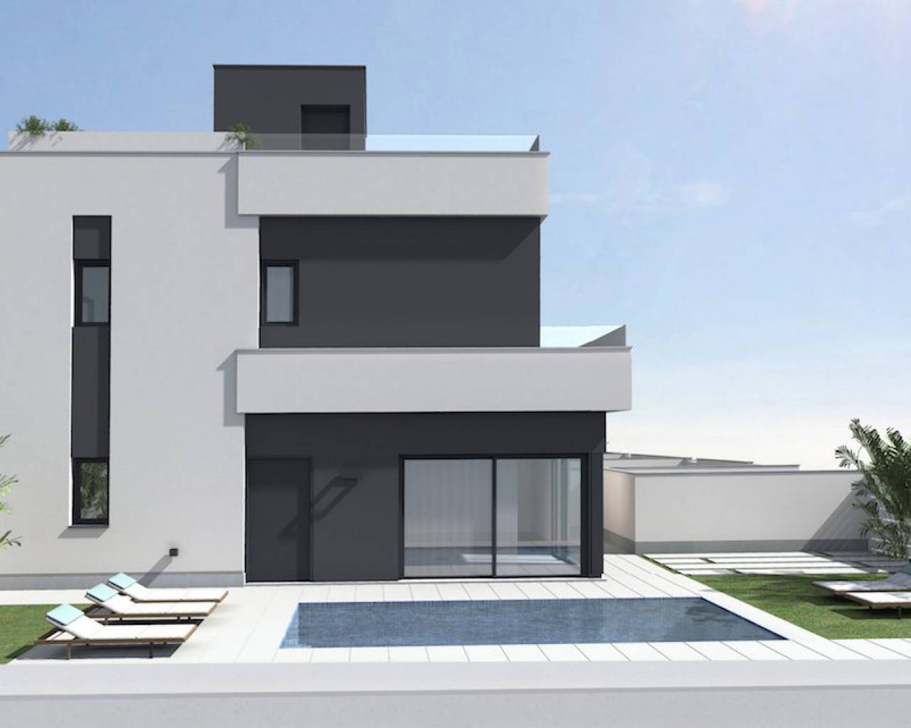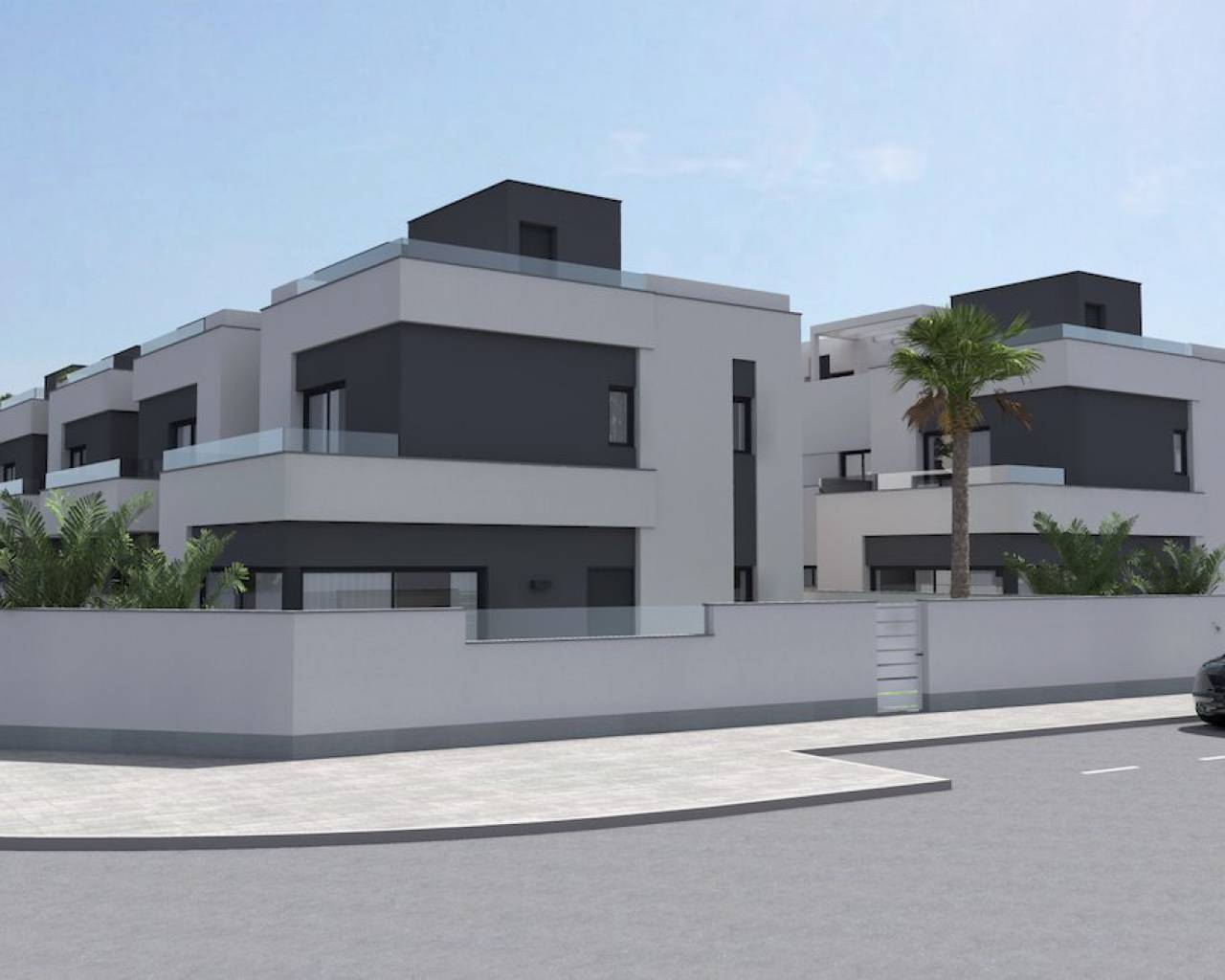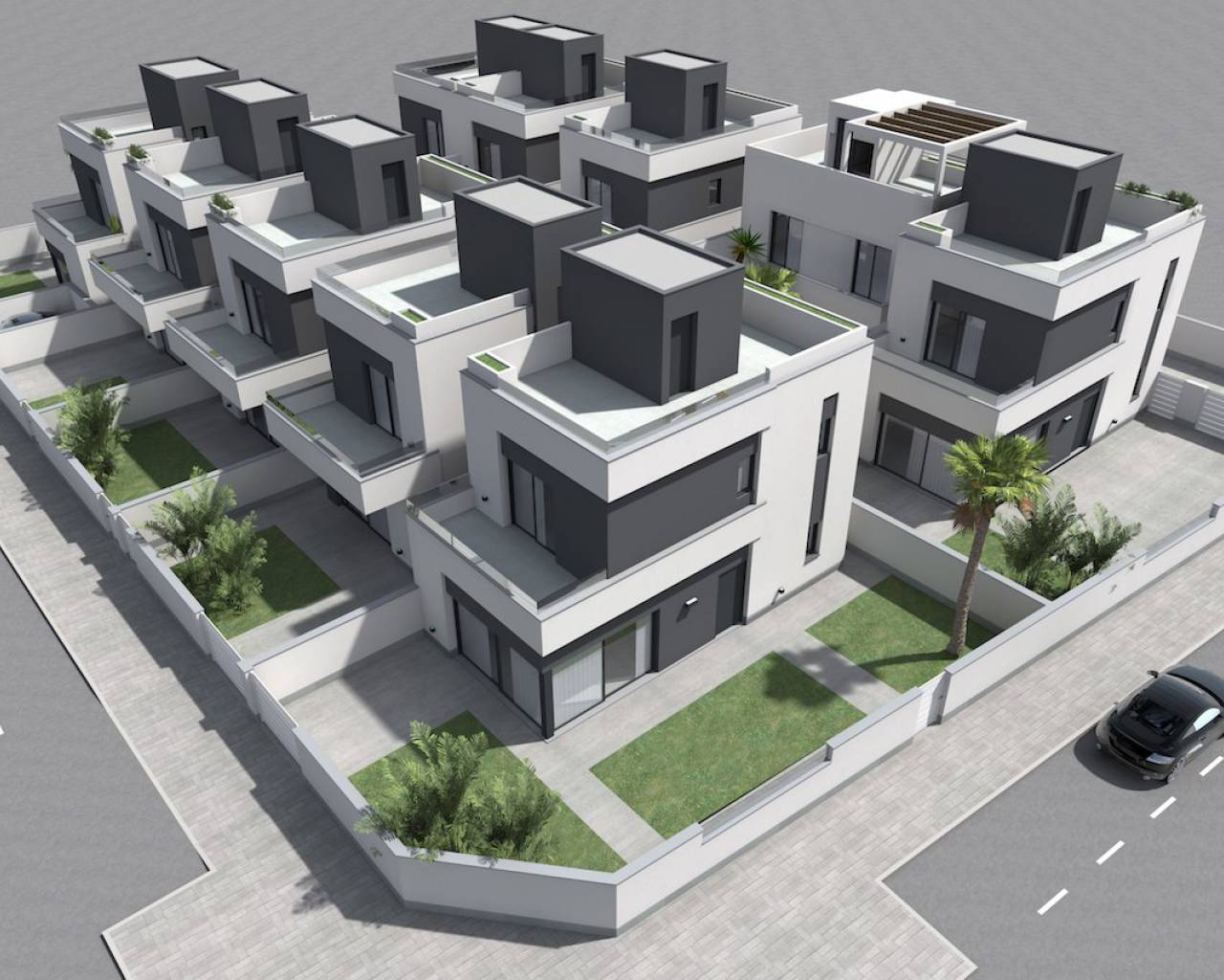 Modern villas located in El Barranco (next to Zenia Boulevard), Orihuela Costa A complex of 10 villas with own plot starting in 120 m2, in a amazing area with all the services at 8 min to the beach by car. And 2 min by car to the autovia A-7, extremely perfect communicated. 3 double bedrooms (double bedroom and a bathroom downstairs) Each bedroom has fitted wardrobes The master bedrooms all have patio doors leading to a large balcony terrace and there are internal stairs leading to the solarium. 2 or 3 bathrooms with underfloor heating Large living room with patio doors leading on to the terrace and garden area open kitchen with fridges-freezer, dishwasher or 45cm, washing machine, extractor, oven, ceramic hob and microwave. Solarium of 32 m2 Front garden of 114-211 m2 Private parking. Included you have underfloor heating in the bathrooms and Pre-installation for A / C. **some plots you have a private pool other have the option of a pool as an extra. NOTE: These images are a preliminary draft of the project, created by computer as an illustration and not binding. The final design may undergo some changes These stunning villas are walkable to bars, shops, restaurants and a school. They are close to several championship golf courses and just a short drive from the beach and the La Zenia Boulevard shopping centre, With easy access via the AP7 and N332 coastal road both Alicante and Murcia San Javier airports can be reached within a 40 minute drive.